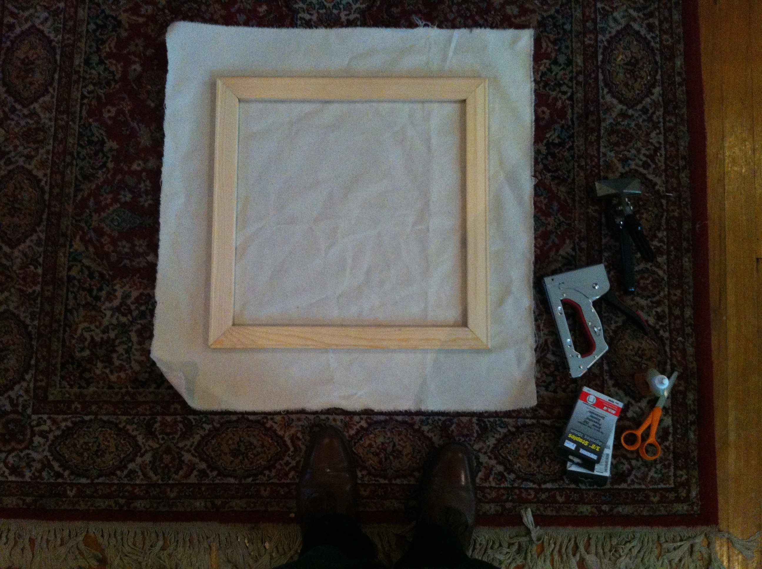 Started work on a commission this week, an image of Patti Smith photographed by Robert Mapplethorpe. Above is some prep work for the painting, stretching on a 20” x 20” frame. Sized the canvas this afternoon, and after drying this evening, gesso and staining tomorrow.