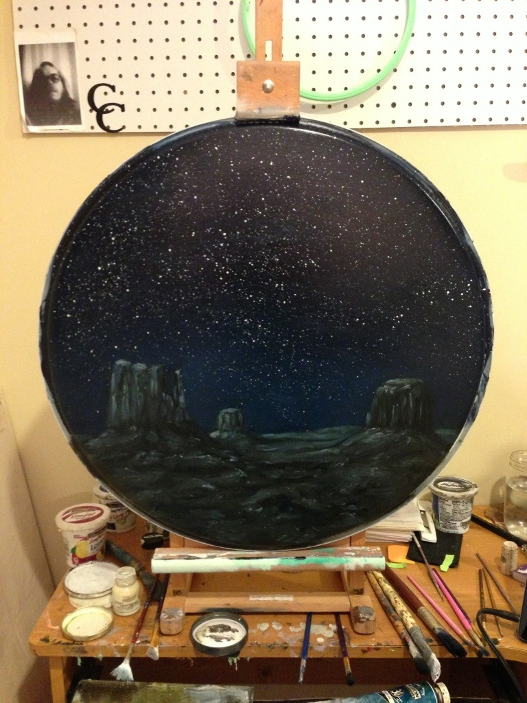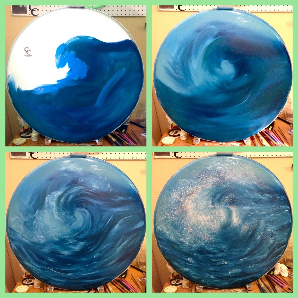 I’m painting on a series of drum heads for C&C Drums here in the Kansas City area. We hope to have a section open through their shop, soon, and make these available to musicians. The feedback has been great so far, and they’re definitely fun to paint!
